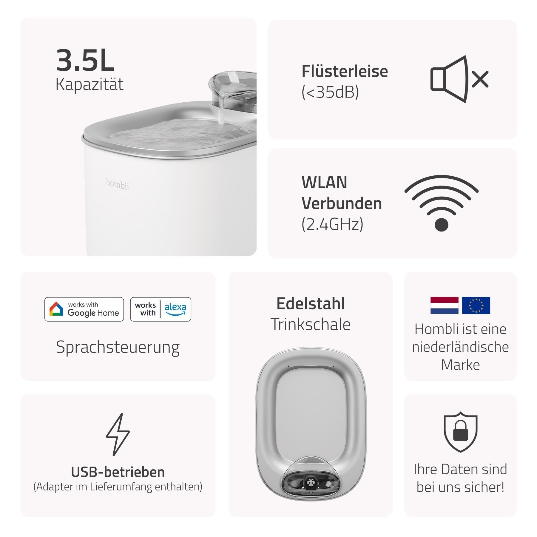 Hombli Smarter Wasserbrunnen Haustiere 3,5 l Weiß USB App-Steuerung Edelstahl