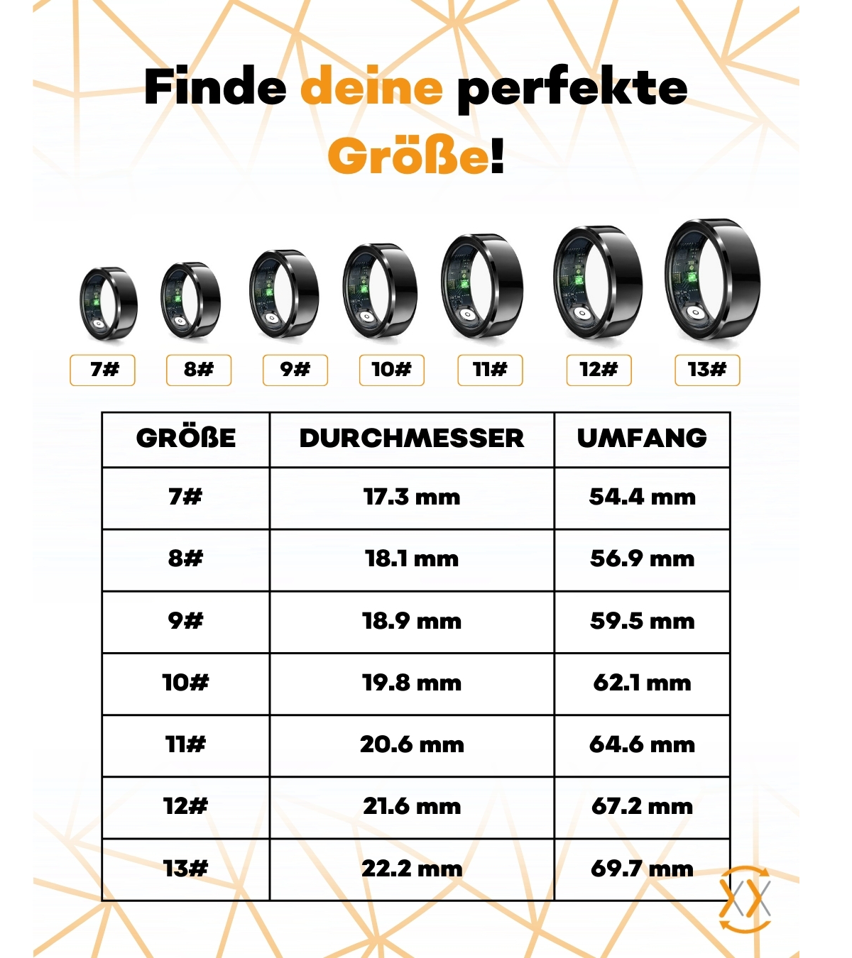 - Größen 6 - 13 (Umfang: 53 - 69,7 mm / Durchmesser: 16,8 - 22,2 mm )