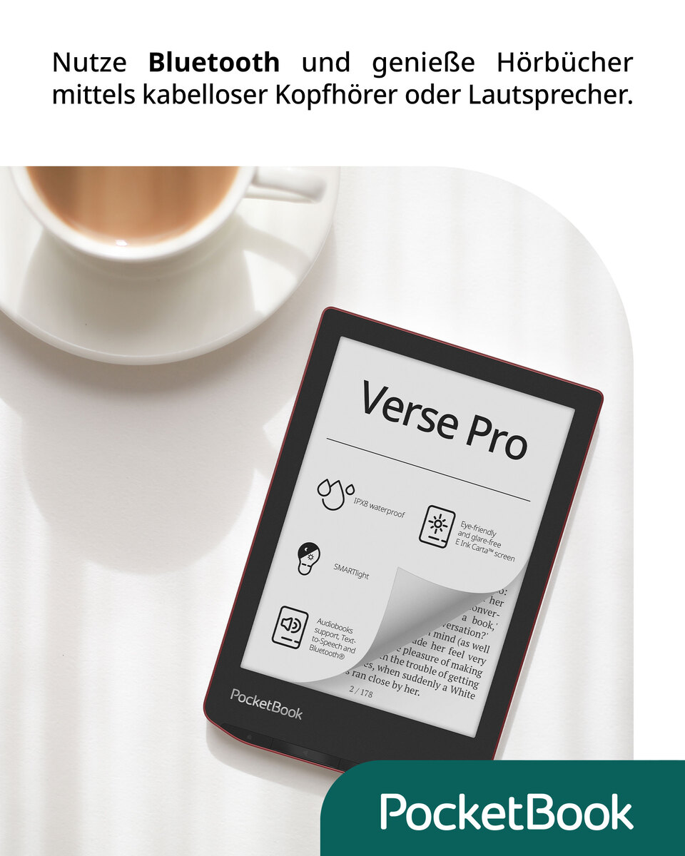 Dank Bluetooth kann der E-Reader mit kabellosen Kopfhörern u. dgl. verbunden werden. So kannst du entspannt Hörbücher hören oder dir dein aktuelles E-Book per Text-to-Speech-Funktion vorlesen lassen und dies sogar gefahrlos in der Badewanne, denn der PocketBook Verse Pro ist gemäß IPX8 wassergeschützt.