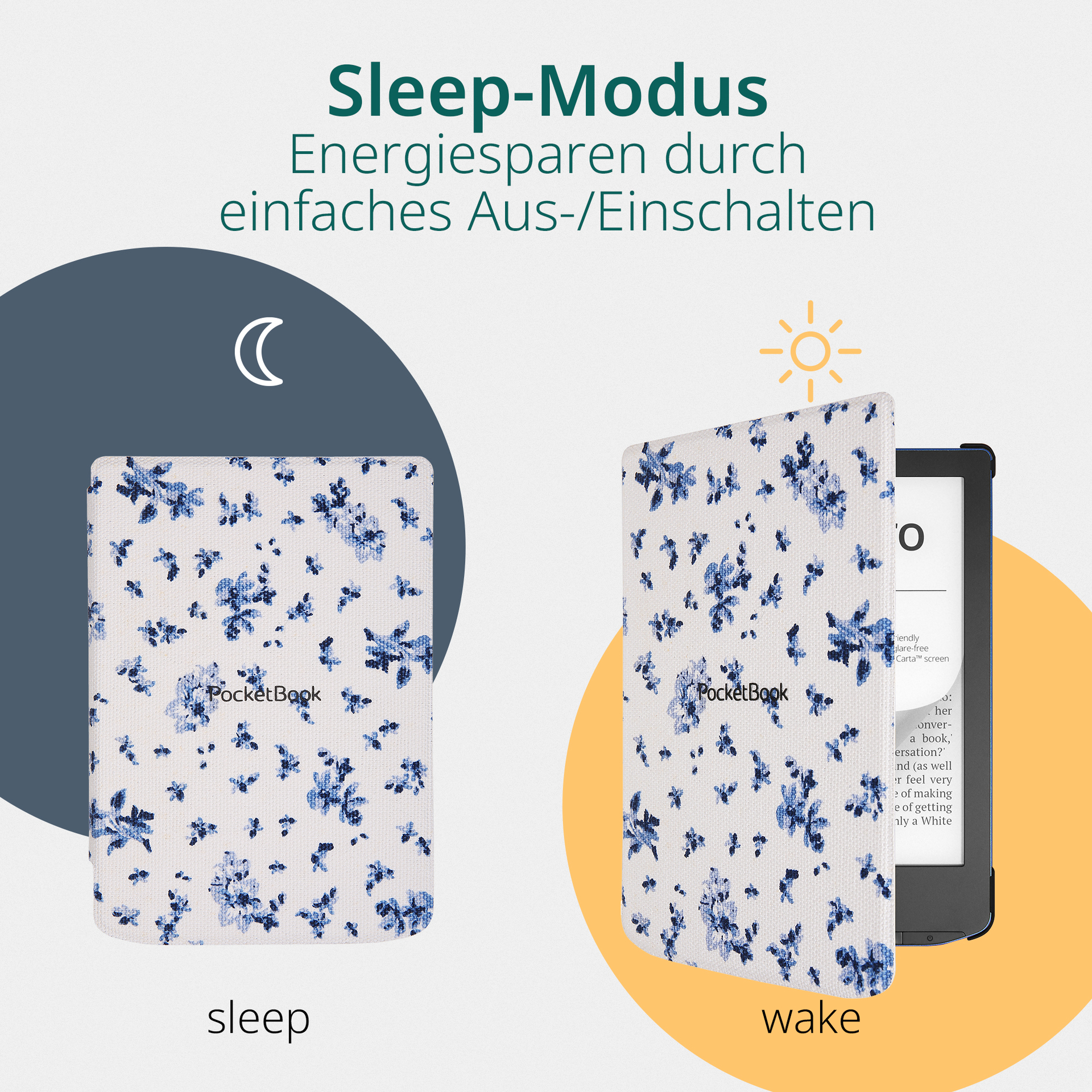 Der E-Reader wird fest in einer stoßsicheren Hartschale fixiert. Die Vorderseite sorgt für den Schutz des Bildschirms. Auf diese Weise schützt das Shell Cover zuverlässig sowohl die Rückseite als auch die Seitenkanten und den Bildschirm des E-Readers. Eingearbeitete Magnete verhindern, dass sich die Schutzhülle ungewollt öffnet. Die Schutzhülle unterstützt die Sleep-Cover-Funktion der genannten PocketBook-Geräte und hilft so die Batterieladung zu schonen. Beim Schließen der Schutzhülle wird das Gerät automatisch in den Sleep-Modus versetzt. Beim erneuten Öffnen des Covers wird der E-Reader sofort aktiviert.